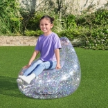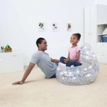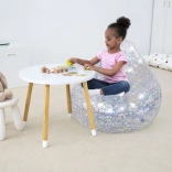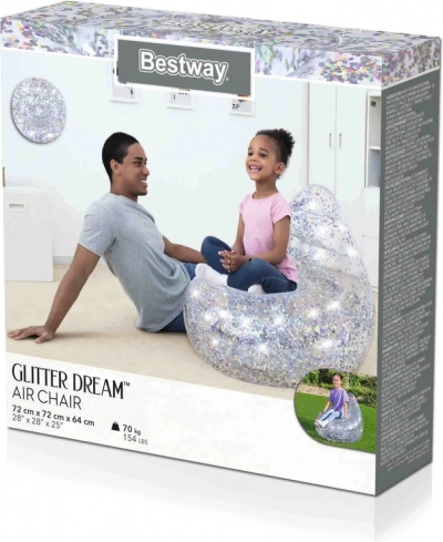 Fotoliul gonflabil se mândrește cu plastic transparent plin de sclipici colorat, care strălucește la fiecare mișcare și adaugă un plus de farmec spațiului tău.