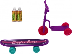 Setul conține de asemenea o trotinetă și un skateboard, oferind posibilități de a explora lumea pe roți, de a exersa abilitățile pe rampe, de a participa la curse sau pur și simplu de a se bucura de mișcare la aer curat. Două sticluțe mici adaugă un element realist și ajută la crearea unor povești fascinante.