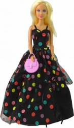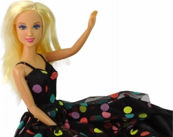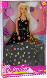 Păpușa DEFA LUCY aduce un stil elegant și detalii fine care îi vor încânta pe micii iubitori de modă. Părul lung, ușor ondulat, blond, rochia lungă neagră cu buline colorate și accesoriile asortate creează un aspect armonios și jucăuș. Machiajul discret al ochilor în tonuri de albastru-roz și buzele roz îi subliniază farmecul.