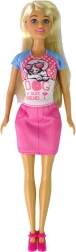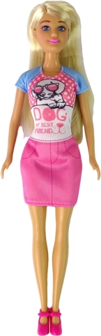 Păpușa cu păr blond lung este articulată la brațe și picioare, adoptă cu ușurință diferite poziții, iar ținuta ei stilată în tonuri de roz îi va încânta pe copii.