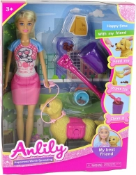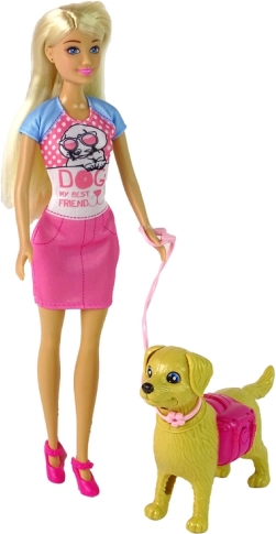 Set drăguț pentru iubitorii de animale: păpușă cu cățel, pe care îl poți hrăni, îl poți scoate la plimbare cu lesă și poți învăța îngrijire și responsabilitate. Păpușa are membre mobile, cățelul reacționează prin mișcarea cozii, urechilor și botului, iar în set se găsesc și bol cu granule, lesă, coș și lopățică.