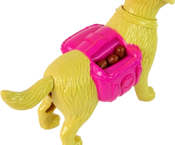 Cățelul galben are coadă, urechi și bot mobile. Datorită recipientului roz și bolului cu granule, poți hrăni cățelul iar și iar și îți poți dezvolta imaginația.