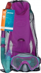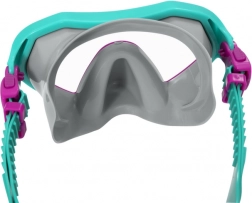 Masca oferă câmp vizual larg datorită lentilelor din policarbonat cu protecție UV, iar etansarea moale din silicon aderă foarte bine la față, în timp ce cureaua ajustabilă asigură stabilitatea. Snorkelul cu muștiuc ergonomic din silicon este prevăzut cu valvă de expirație și stoper de val împotriva pătrunderii apei. Labele cu curea ajustabilă mărimea 37–41 ajută la o propulsie eficientă și la o deplasare ușoară în apă.