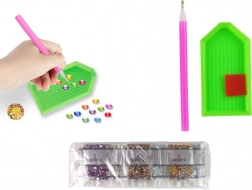 În set veți găsi cristale de culori diferite, care vor fi utilizate pentru a decora autocolantele. Suprafața autocolantelor este acoperită cu un strat adeziv, cu numerotare pentru utilizarea culorilor. Alăturați cristalul unul câte unul și creați un mic obiect de artă.