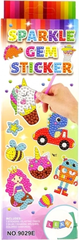 Setul include tot ce este necesar pentru crearea autocolantelor strălucitoare, care îi vor încânta pe toți pasionații de creație. Această activitate creativă stimulează răbdarea, precizia și îndemânarea manuală. Fiecare autocolant are suprafața acoperită cu un strat de adeziv și indicatoare de culori pentru diamante, care trebuie atașate. Creează o mică operă de artă lipind fiecare diamant separat! Autocolantele ilustrează rachete spațiale, farfurii zburătoare, astronauți în forme de animale și planete mici.