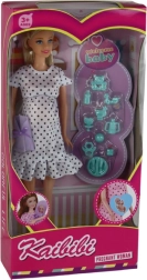 Păpușa se laudă cu un aspect elegant în rochie albă cu buline negre, pantofi roz și moda este completată de o poșetă mică.