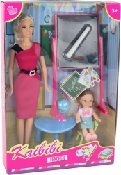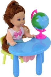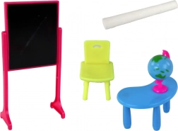 Descoperiți un set uimitor de jucării care include o profesoară și o elevă, îmbrăcate în ținute elegante și stilate. Setul este completat de o tablă cu cretă, o măsuță și un scăunel, ideale pentru crearea unui mediu școlar. Globul oferă oportunități excelente pentru jocuri de învățare și explorare a lumii.