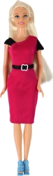 Păpușă profesoară cu păr lung blond și rochie roz elegantă cu curea neagră.
