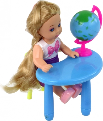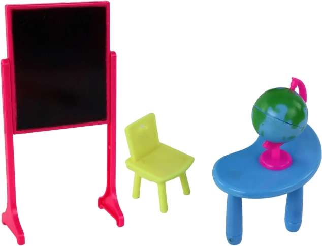 În plus, conține un birou și un scăunel, pe care păpușile pot să se așeze confortabil, imitând perfect mediul școlar.