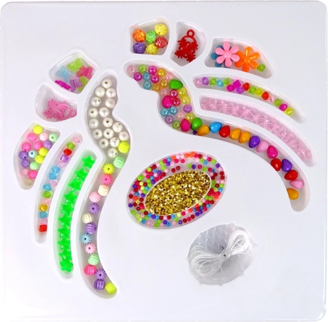 Realizați-vă propriile brățări și coliere originale cu acest set pentru creat bijuterii. Conține un mix variat de mărgele și pandantive în forme diverse (floricele, perluțe, steluțe, pietricele) și șnururi pentru înșirat practice. Susține creativitatea și motricitatea fină și este un cadou grozav pentru copii de la 5 ani, în ambalaj cadou cu fereastră transparentă.