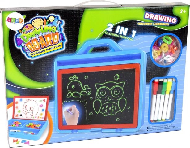 Această tablă pentru copii susține imaginația și învățarea într-un mod distractiv. Cu ajutorul markerului LED, copiii creează pe panoul special desene strălucitoare, care prind viață în semiîntuneric. Cealaltă față servește ca tablă albă pentru scris și desen cu markere ștergibile, astfel încât pot exersa litere, cifre și primele calcule iar și iar.