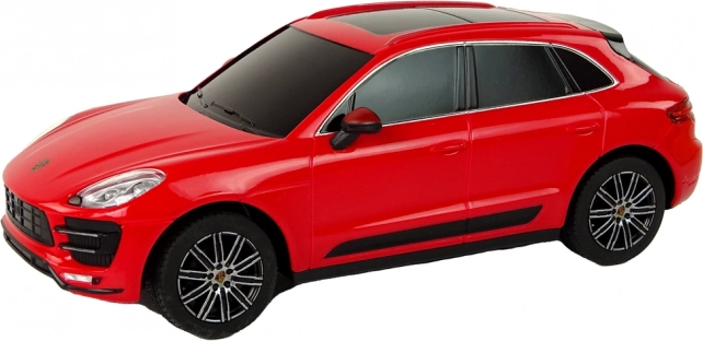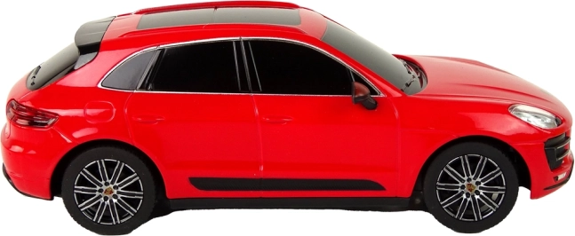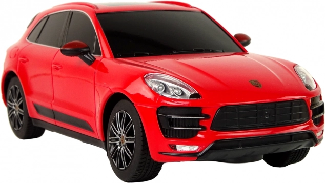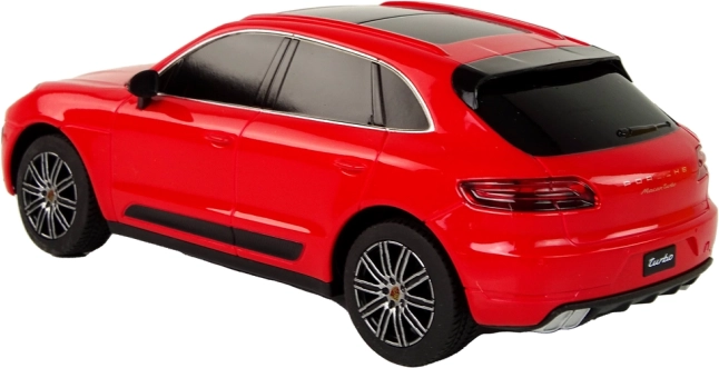 Reproducere detaliată a Porsche Macan Turbo la scară 1:24, cu vopsea roșie elegantă și geamuri fumurii, impresionând de la prima vedere.