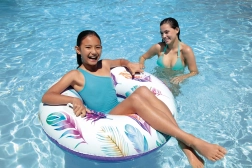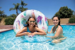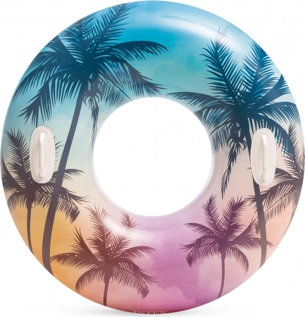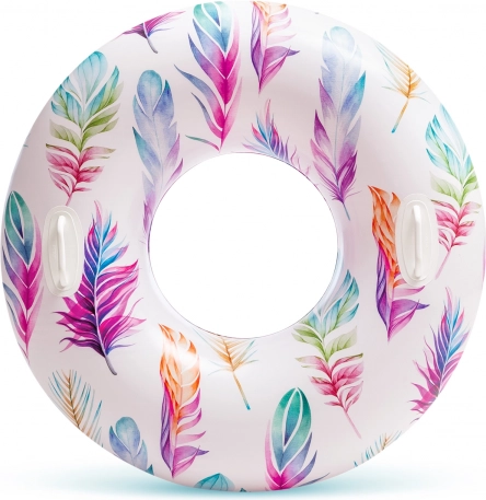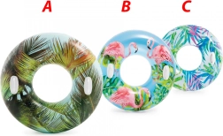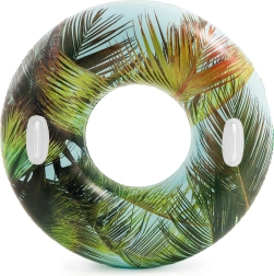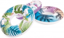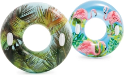 Materialul durabil, cu grosimea de 0,25 mm, rezistă bine utilizării obișnuite la piscină și la mare. Datorită motivelor tropicale cu palmieri sau flamingo, colacul atrage atenția și adaugă stil proaspăt echipamentului tău de vară.