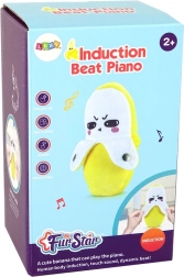 După activare și atingerea butonului argintiu, banana redă melodii vesele – piese clasice și populare care îi motivează pe copii să descopere sunetele.