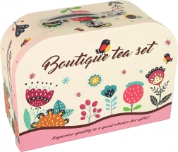 - 4 cești, 4 farfurii mari, 4 farfurii mici, ceainic, tavă, valiză