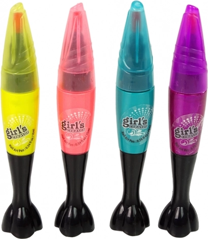 Setul conține patru culori intense (roz deschis și roz închis, turcoaz/verde, galben), cu care desenezi ușor linii, puncte și modele fine.