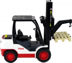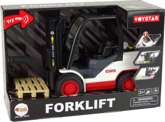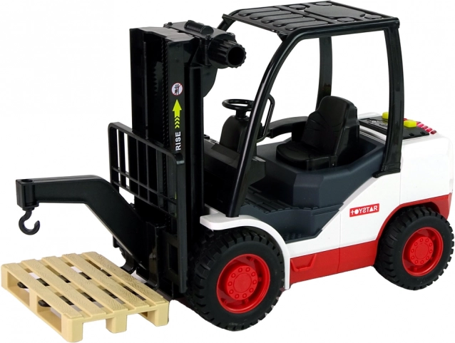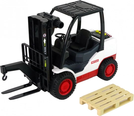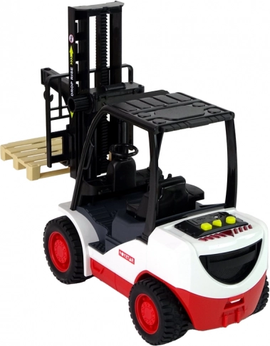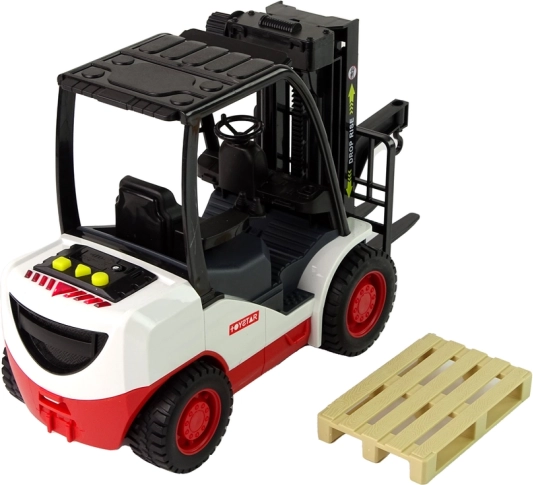 Acest stivuitor detaliat îi va încânta pe toți micii iubitori de utilaje. Datorită comenzii rotative, furcile pot fi ridicate și coborâte cu ușurință, în timp ce trei sunete realiste și lumină roșie la apăsarea butoanelor galbene intensifică experiența de joc. Include o paletă detașabilă pentru încărcare și descărcare.
