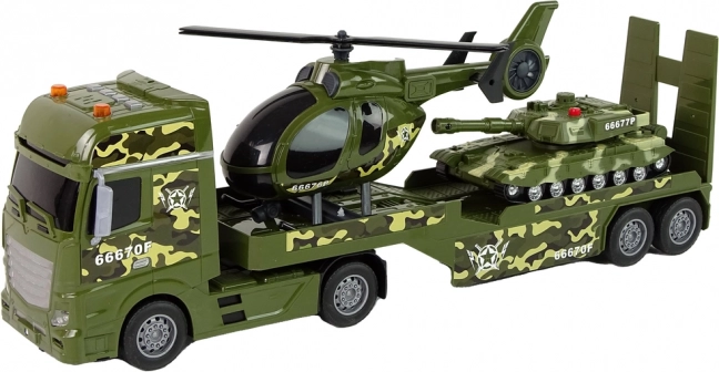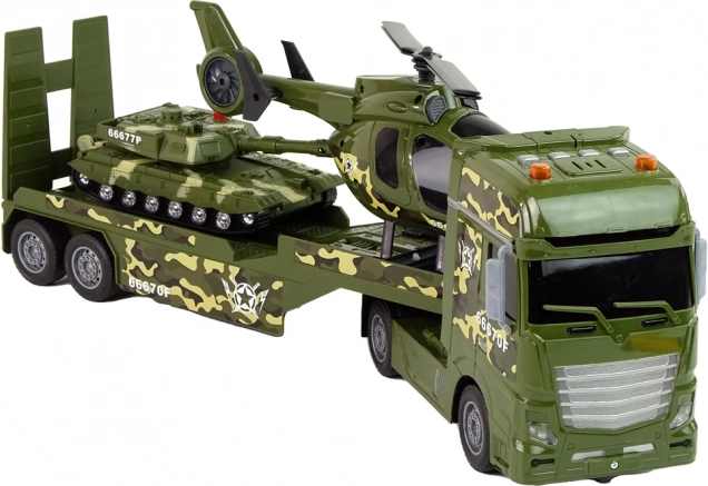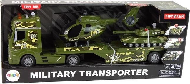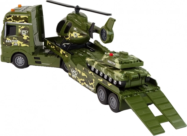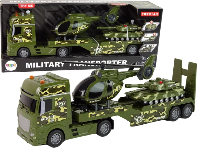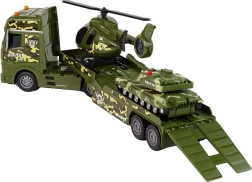 Acest set detaliat include trei vehicule militare îndrăgite într-un design unitar de camuflaj: camion cu remorcă detașabilă, elicopter cu rotoare rotative și tanc cu mecanism de inerție. Datorită detaliilor realiste, părților mobile și efectelor luminoase și sonore, copiii își pot crea cu ușurință propriile misiuni de aventură.