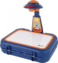 Acest proiector interactiv pentru desen, în practică valiză albastră, le permite copiilor să proiecteze imagini de pe discuri tematice (animale, îmbrăcăminte, mingi, fructe, legume, mijloace de transport) pe o suprafață albă și să le contureze cu ușurință. Suportul ajustabil ajută la reglarea înălțimii proiecției pentru ca desenul să fie mereu confortabil și clar.