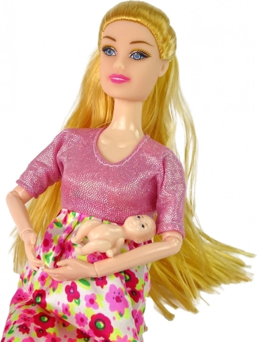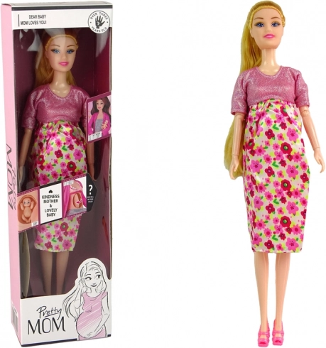 Această frumoasă păpușă însărcinată, cu părul blond lung și rochie roz adorabilă cu motiv floral, aduce farmec și stil în joacă. Burtica este ușor de rotit pe partea plată. Este ideală pentru micile domnișoare care iubesc păpușile și crearea poveștilor magice.