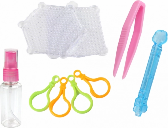 - Conținutul pachetului: mărgele (8 culori), plăcuță pătrată și hexagonală, pensetă, aplicator/stilou, pulverizator, 4 inele pentru pandantive, cărticică cu modele.