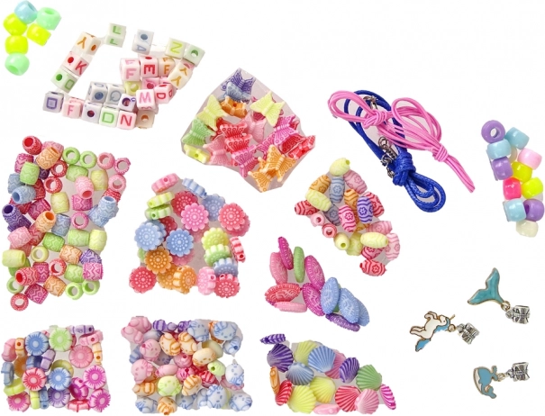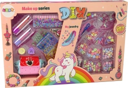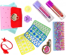 În set se găsesc, de asemenea, zirconii colorați ce pot fi folosiți pentru decorarea proiectelor creative și două inele drăguțe reprezentând o floare și o buburuză, care nu doar adaugă strălucire, ci și eleganță. Pe lângă acestea, conține mărgele colorate de diferite forme, două fire roz, un șnur albastru și trei pandantive diferite pentru a crea brățări și coliere personalizate.