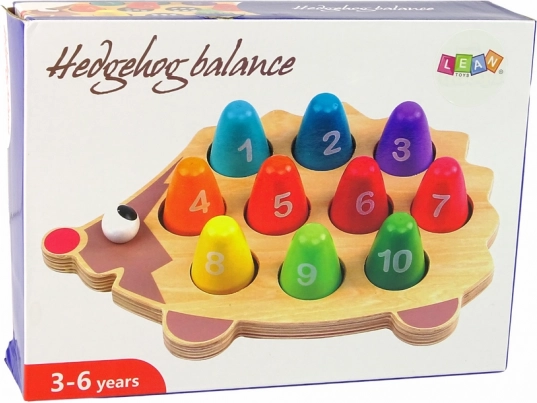 Pachetul include ariciul din lemn și 10 țăruși colorați. Dimensiuni arici: 24,5 × 1 × 16 cm; țăruși: 3 × 4 × 3 cm; ambalaj: 26 × 5,5 × 19 cm. Potrivit pentru copii de la 3 ani.