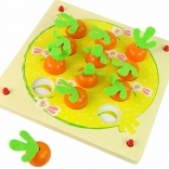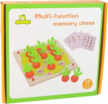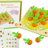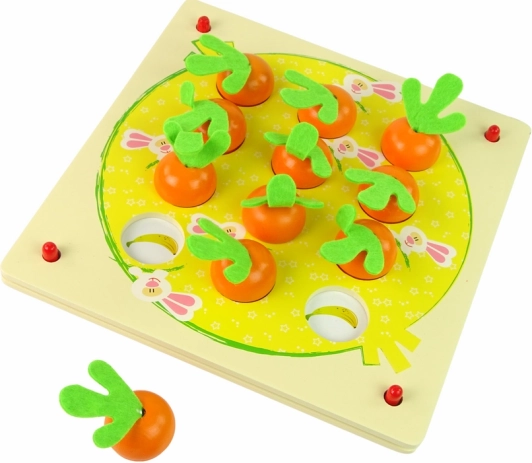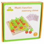 Acest joc din lemn de înaltă calitate susține concentrarea și antrenează memoria într-un mod distractiv. Copiii introduc piesele drăguțe cu fructe și legume în orificiile corecte conform șablonului ales și caută perechile corespunzătoare. Construcția robustă asigură durabilitate îndelungată și joacă în siguranță.