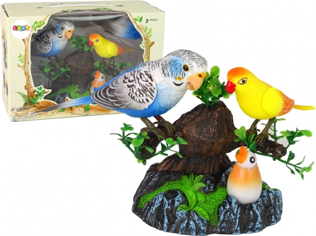 Setul conține doi papagali – unul albastru și unul galben, așezați pe o creangă a copacului, și un puișor într-o cochilie, care stă dedesubt.