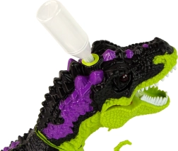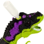 Pe capul dinozaurului există un orificiu în care puteți turna apă, cu ajutorul sticluței incluse. Prin apăsarea butonului de pe telecomandă (funcționează cu 2 baterii AA - neincluse) puteți elibera abur prin botul acestuia, imitând un foc arzător. În pachet găsiți și o telecomandă sub forma unui „bloc de dinozaur”, cu care puteți controla deplasarea lui înainte.