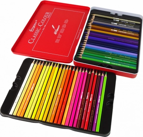 Creioanele sunt păstrate într-o cutie metalică robustă cu două nivele de culoare roșie, având dimensiunile de 28 cm x 19 cm x 2,5 cm, ceea ce o face o soluție comodă pentru transport și depozitare. Instrument ideal pentru cei care prețuiesc ordinea și mobilitatea.