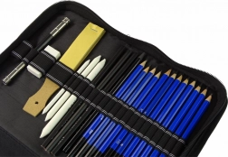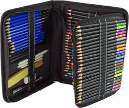 - 72 creioane colorate; 12 creioane grafit de diferite durități; cărbune în 3 durități; 3 estompatoare + curățător; radieră; ascuțitoare; prelungitor pentru creioane