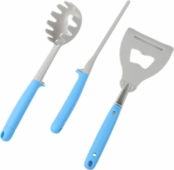 Setul include unelte precum lingură pentru paste, curățător și ascuțitor, permițând o simulare completă a pregătirii culinare.