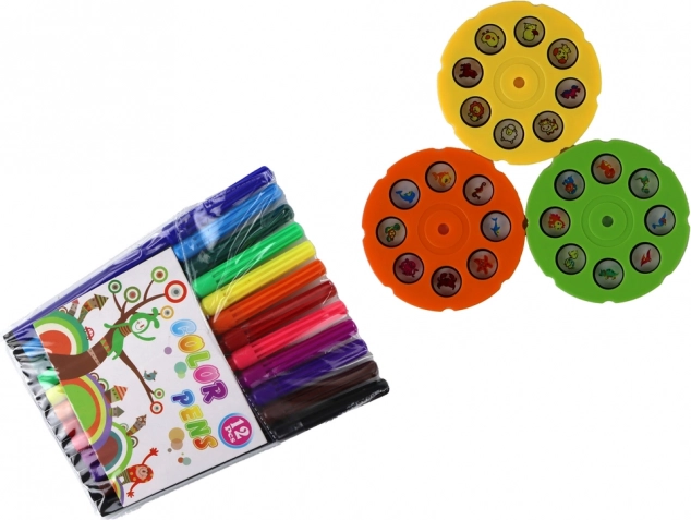 Pachetul include 3 discuri de proiecție cu imagini diverse, 12 markere colorate, caiet și o tăbliță-organizator practică, care păstrează toate piesele laolaltă. Jucăria susține motricitatea fină, antrenează imaginația și îi învață pe copii să recunoască animalele prin joc.