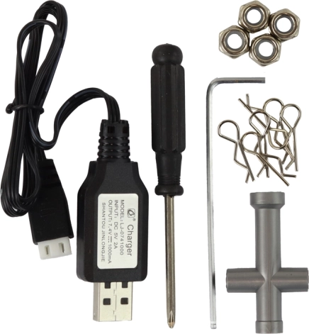 Datorită farurilor LED, modelul este atrăgător și la plimbările de seară. Acumulatorul de 1400 mAh oferă 12–16 minute de rulare la o singură încărcare și se reîncarcă ușor cu încărcătorul USB inclus. Telecomanda cu rază de până la 60 de metri folosește baterii AA obișnuite.