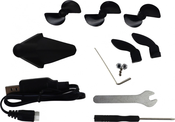 Setul include și accesorii, precum cablu pentru baterie, stativ pentru barca cu motor, care asigură stabilitate pe uscat, două elice interschimbabile și două cârme interschimbabile.