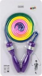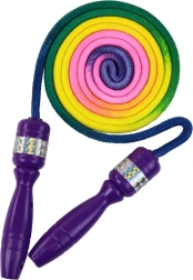 Vă propunem o coardă de sărit neobișnuită, în culori de curcubeu, cu mânere mov. Deși este una dintre cele mai simple jucării, coarda de sărit și-a păstrat popularitatea de zeci de ani, bucurând atât copiii, cât și părinții.