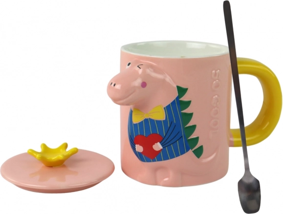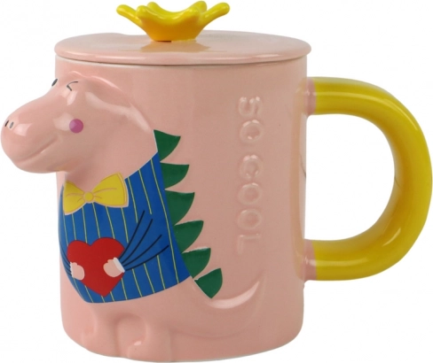 Această cană ceramică stilată îmbină funcționalitatea cu un design jucăuș. Corpul roz cu toartă galbenă este completat de un capac cu coroniță galbenă, care protejează băutura și definitivează aspectul original. Motivul 3D în relief cu dinozaur aduce bucurie fiecărei înghițituri – ideală pentru cafea, ceai și cacao.