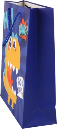 Pungă cadou din hârtie, stilată, cu motiv vesel de dinozauri în culoare elegantă albastru închis. Mâner din șnur rezistent, spațiu generos și dimensiuni 41,5 × 30 × 12 cm o fac alegerea ideală pentru zile de naștere, petreceri pentru copii și sărbători.