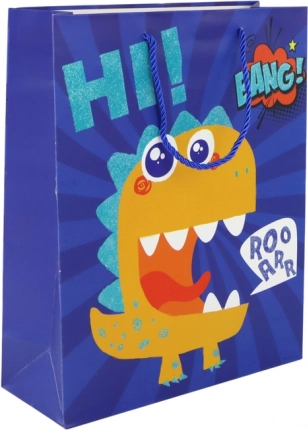 Această pungă cadou cu un motiv jucăuș de dinozaur oferă fiecărui cadou un aspect distractiv și original. Fundalul universal albastru închis are un aer elegant, în timp ce grafica expresivă atrage în special copiii. Punga este potrivită pentru diverse ocazii – de la zile de naștere la petreceri pentru copii.