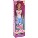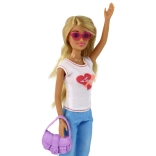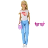 Păpușa poartă un tricou alb cu motiv inimă/buze, pantaloni albaștri și adidași albi. Geanta mov și ochelarii de soare roz permit crearea unor combinații stilate pentru orice ocazie.