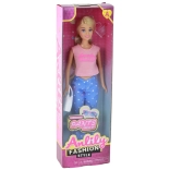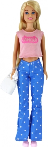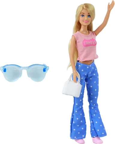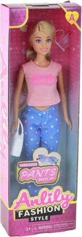 Păpușa stilată ANLILY cu păr blond lung vine cu un top roz, pantaloni albaștri cu steluțe și teniși roz. Setul include o geantă albă și ochelari albaștri pentru styling creativ. Dimensiuni păpușă 30 × 7 × 5 cm, ambalaj 32 × 11 × 5 cm. Certificare CE, standard EN71, potrivită de la 3 ani.