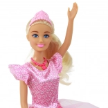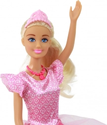 Păpușa este îmbrăcată în rochie roz cu modele detaliate și sclipici, transformând-o într-o adevărată icoană a modei.