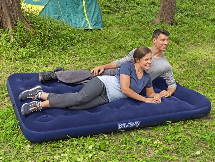 Saltea gonflabilă dublă BESTWAY 191×137×28 cm cu pompă cu piciorul, construcție coil-beam și suprafață flockată. Somn confortabil pentru camping și pentru oaspeți.