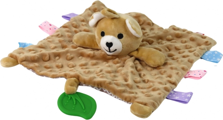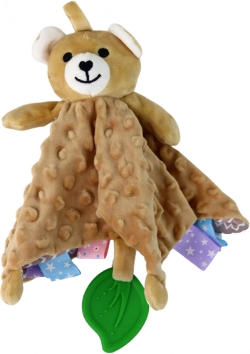 Prezintă pătură din pluș cu ursuleț, care combină moliciunea și funcționalitatea pentru a încânta și calma copilul dumneavoastră. Conține un inel de dentiție și panglici colorate pentru stimulare senzorială.