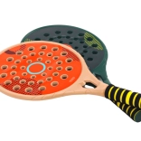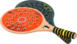 .Set de 2 palete de padel pentru jocul sportiv – padel, în culori elegante verde și crem. Paletele sunt fabricate din plastic de înaltă calitate, fiind rezistente și robuste. În loc de plasă (ca la racheta tradițională de tenis) au plastic perforat.