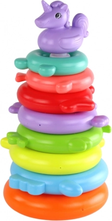 Copiii stivuiesc inelele de la cel mai mare la cel mai mic, dezvoltând în mod natural gândirea logică, recunoașterea culorilor și clasificarea. Unicornul din vârf adaugă jocului o notă magică.
