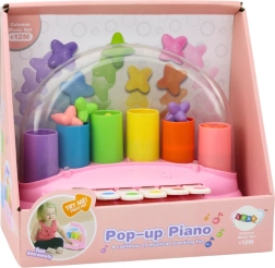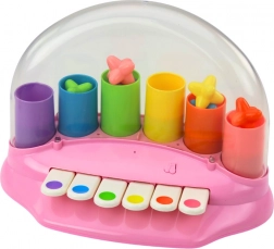 Pianina roz pentru copii aduce o îmbinare unică între muzică și efecte vizuale. Fiecare clapă produce un sunet melodios și activează un mecanism care aprinde și pune în mișcare steluțe colorate sub cupola transparentă. Steluțele care cad sunt ghidate pe o pistă specială, astfel încât la fiecare notă apare un nou efect fermecător.