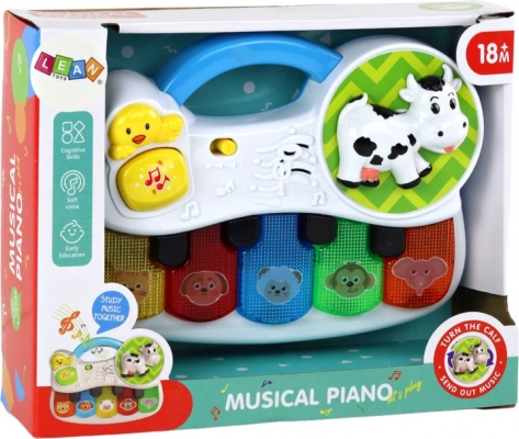 Descoperă lumea muzicii cu această pianină compactă pentru cei mici. Oferă 5 clape colorate cu animăluțe, efecte luminoase și sunete care stimulează simțurile copilului. La apăsarea butonului galben pornește o melodie veselă, iar văcuța rotativă captează atenția și distrează. Ideală pentru dezvoltarea motricității fine, a auzului și a imaginației.
