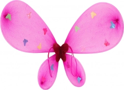 Aripi mari roz cu motive colorate de fluturi și contur luminos. Construcție ușoară și prindere cu elastic pentru purtare confortabilă.